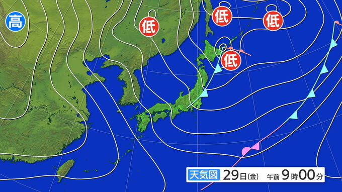 29日午前9時の天気図です。北海道の東に低気圧があり、寒冷前線が東北から関東にかけてのびています。