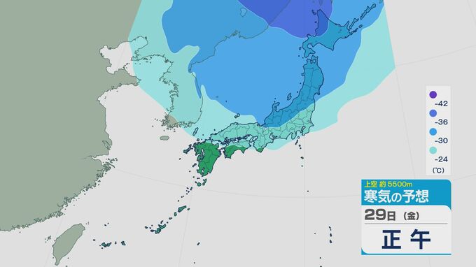 上空およそ5500メートルの寒気の予想ですが、29日は石川県など北陸より北では-30度以下になっています。