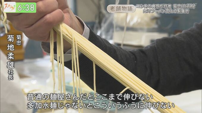 --菊地柔雄社長(菊忠)「うちの麺は伸びるんですよ!普通の麺屋さんだとここまで伸びない。多加水麺じゃないとこういう風に伸びない。」