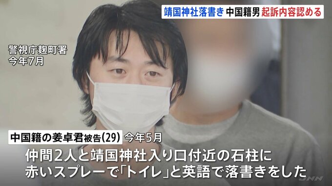 今年5月、東京・千代田区の靖国神社の石柱にスプレーで「トイレ」と落書きされた事件で、器物損壊などの罪に問われている中国籍の男の初公判があり、起訴内容を認めました。中国籍の姜卓君被告(29)は今年5月、仲…