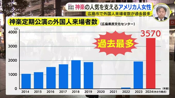 広島市の神楽の定期公演で外国人の来場者数が過去最多を更新しました。外国人の人気を支えているアメリカ人の女性を取材しました。