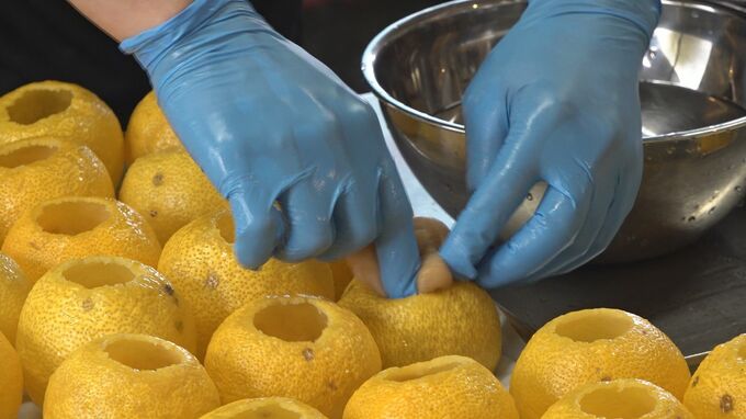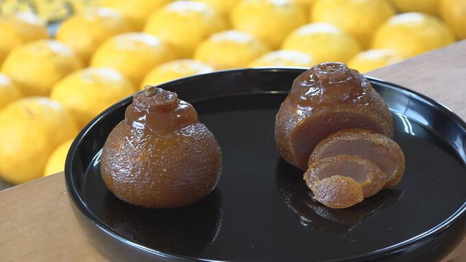 くり抜いた柚子の中に、砂糖や醤油などで味付けした餅種(もちだね)を入れ、蒸しと乾燥を繰り返します。