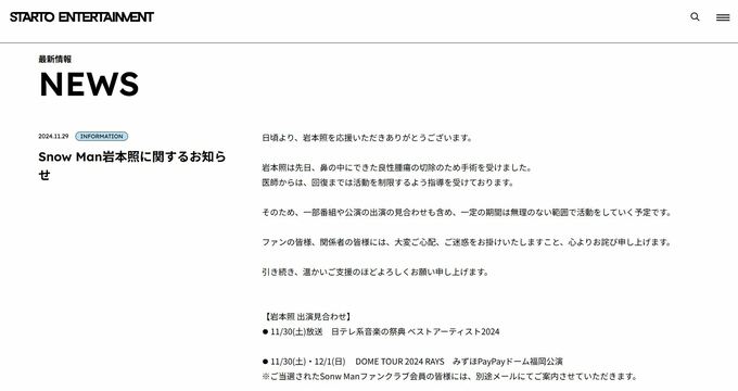 株式会社STARTO ENTERTAINMENTが、「Snow Man」の岩本照さんの一時出演見合わせを公式サイトで公表しました。岩本さんは「鼻の良性腫瘍の切除」ために手術を受けたとのことです。