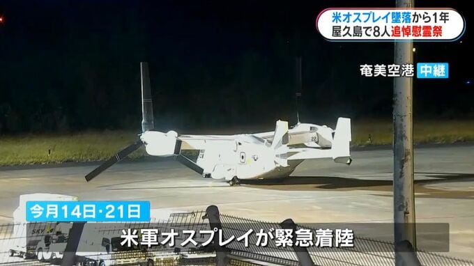 1年前のきょう29日、屋久島空港近くの海上でアメリカ軍のオスプレイが墜落し、乗員8人全員が死亡しました。