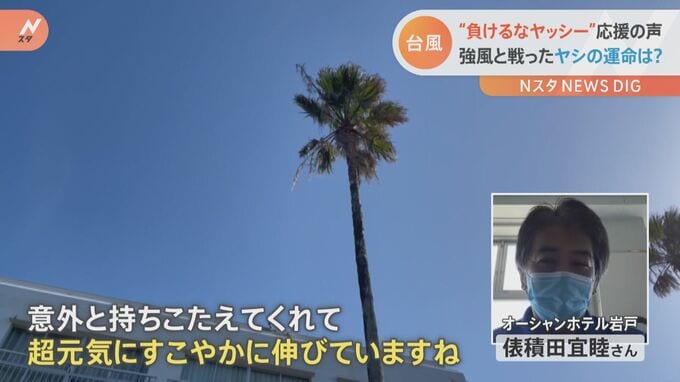 台風を耐え抜いたヤッシーは、葉っぱが少なくなりましたが無事。ちなみに、このホテルの3階の部屋が“ヤッシーの絶景ポイント”だということです。