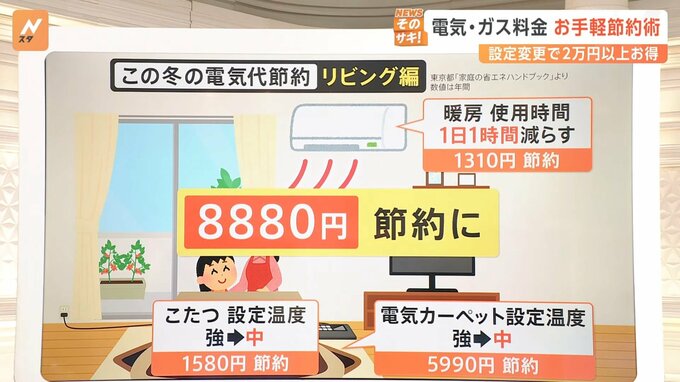 ちょっとずつ工夫することで、リビングだけで年間8880円の節約になるということです。