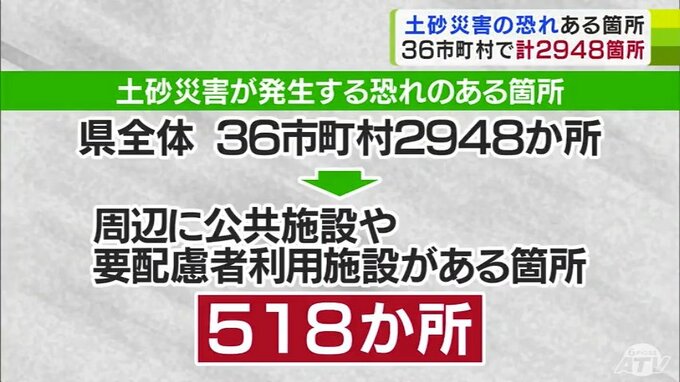 県全体では、36市町村であわせて2948か所に上り、このうち周辺に公共施設もしくは病院や学校などの要配慮者利用施設があるのは518か所です。