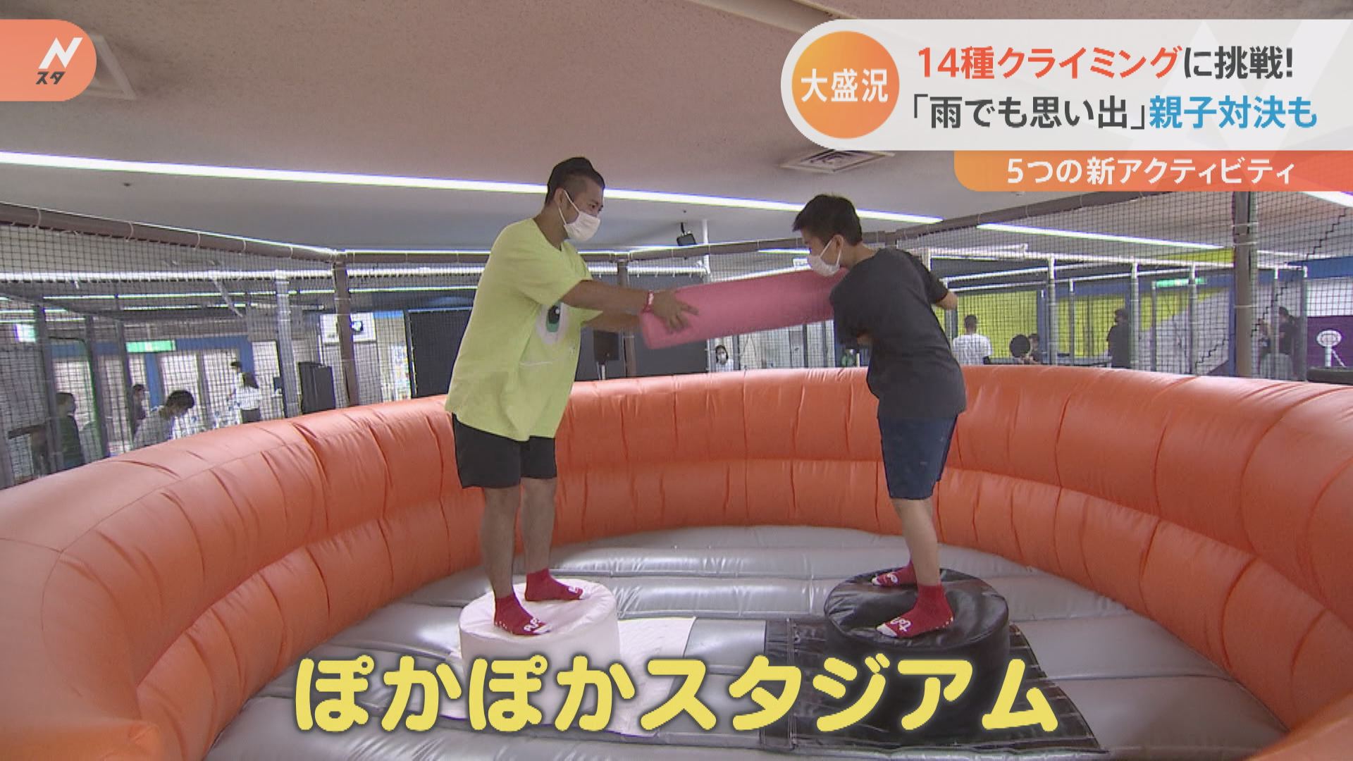 挑戦しているのは台風の影響で予定を変更し、遊びに来たという親子。お父さんは、小学4年生の息子相手に手加減なし!一方、男の子はうまくバランスを取りながら、お父さんに挑みますが…失敗。負けちゃったけど、とても楽しそうでした。