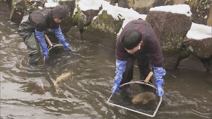 本格的な冬の訪れを前に、岐阜県飛騨市の観光名所・瀬戸川でコイの引っ越しが行われました。