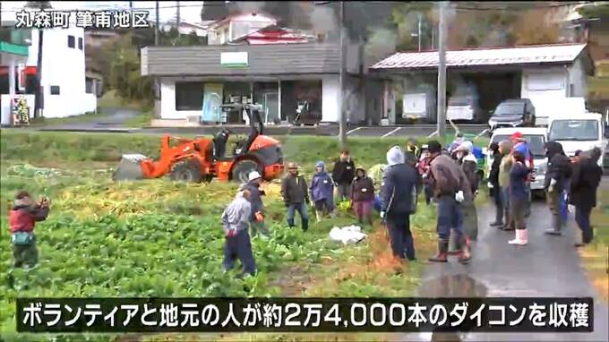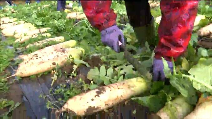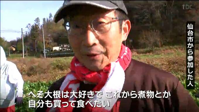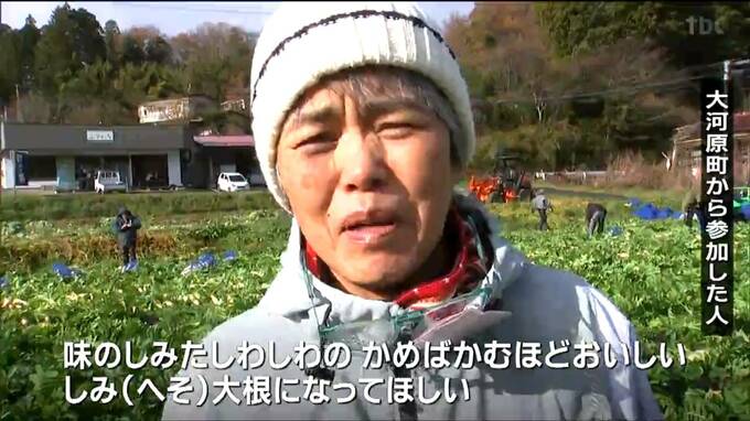宮城県丸森町で、特産の「へそ大根」の仕込みが始まるのを前に11月30日、ボランティアも手伝ってダイコンの収穫が行われました。