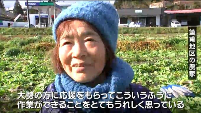 丸森町の筆甫地区にある畑で、町内外から訪れたおよそ30人のボランティアと地元の人たちがおよそ2万4000本のダイコンを抜いていきました。