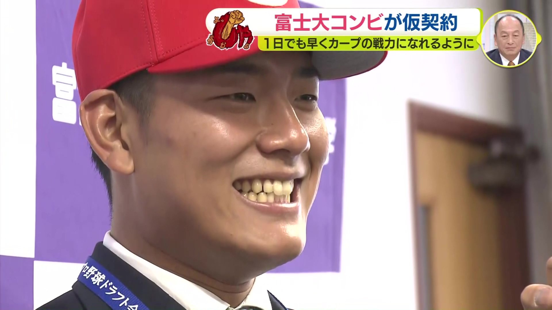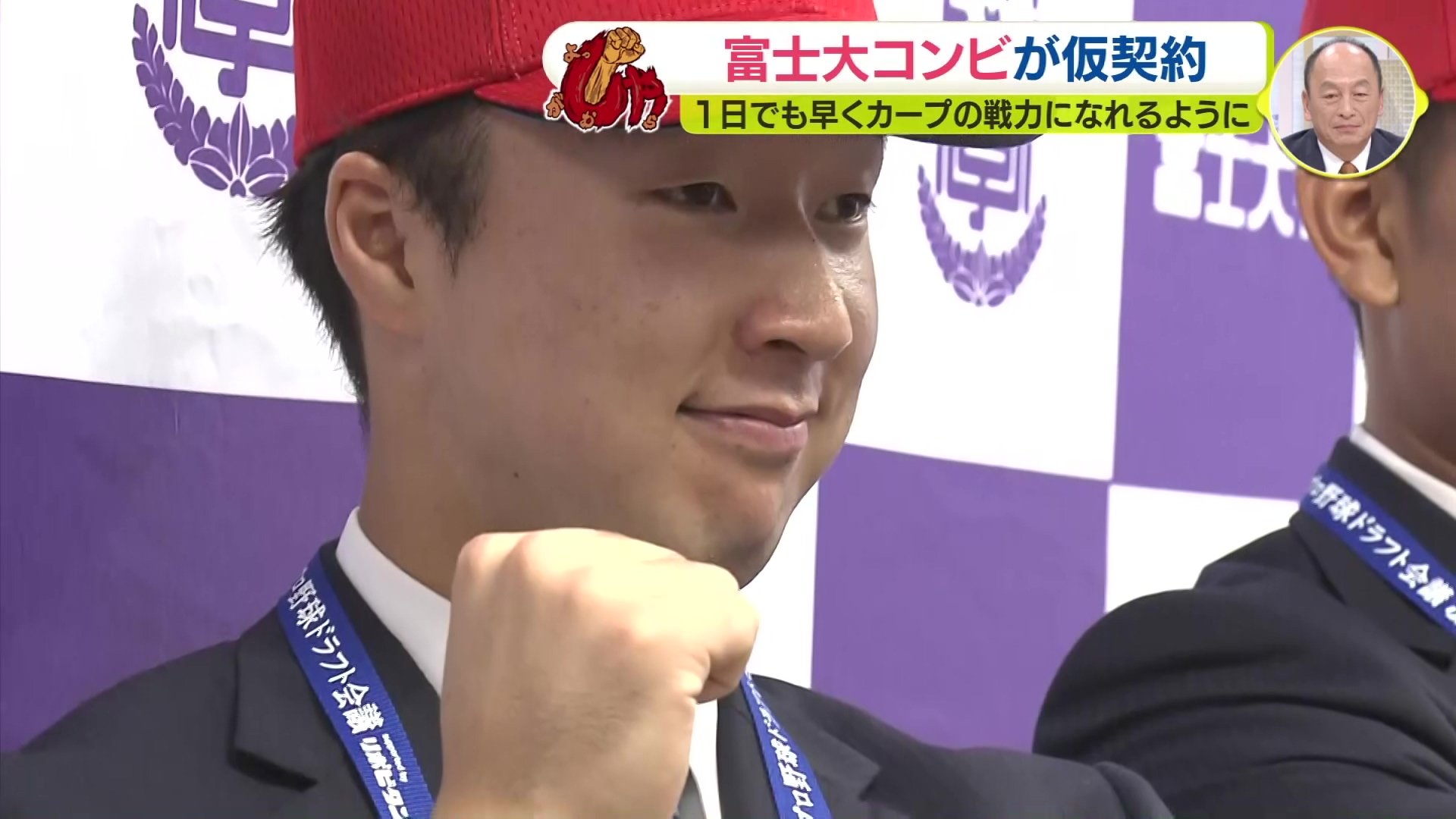 ことしのプロ野球ドラフト会議で同一チームからの過去最多人数となる6人指名を受けた富士大学。その6人のうち、カープから指名を受けた2人が、岩手県花巻市内のホテルで仮契約交渉に臨みました。