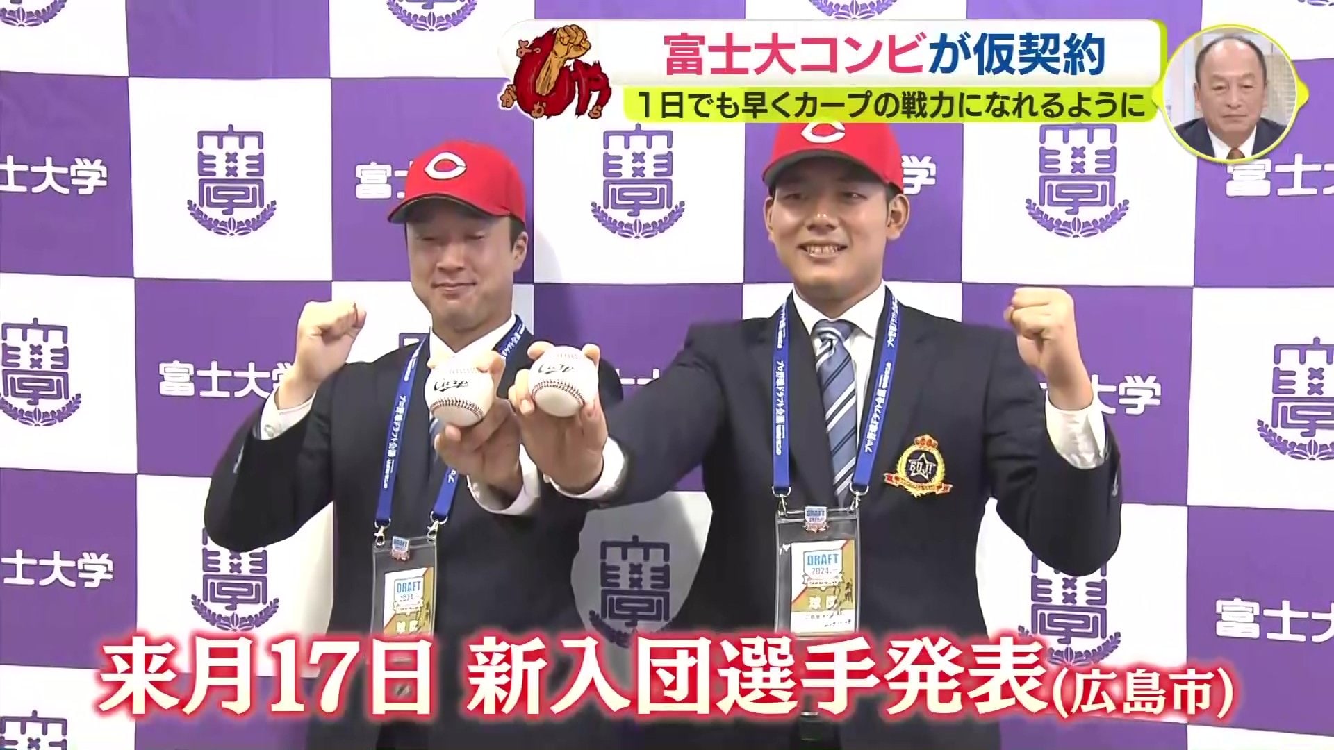 広島カープからドラフト指名を受けた富士大学(岩手)コンビが29日、仮契約を結びました。