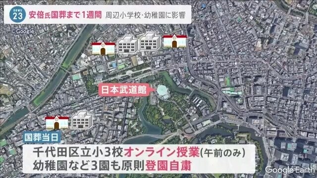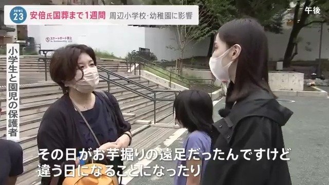 安倍元総理の国葬まで1週間。都内では警備が強化されるなど準備が進んでいます。会場近くの一部小学校や幼稚園等では、国葬当日、オンライン授業や原則登園自粛に。保護者からは「授業内容の進み具合が気になる」「芋ほり遠足が別日になった…」との声も聞かれました。