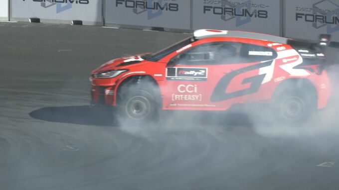 豊田市の太田市長から認定証を受け取ったモリゾウ選手は、ラリーカーに乗り込むと豊田スタジアム内に設けられた特設コースでデモランを披露。