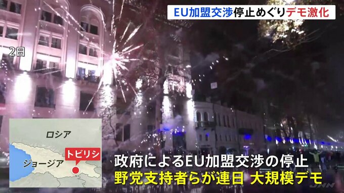 ジョージアでは大規模なデモが激しさを増しています。ロシアの隣国ジョージアでは、政府がEU=ヨーロッパ連合への加盟交渉を停止したことをめぐり、EU加盟を求める野党支持者らが連日、大規模なデモを行っています…
