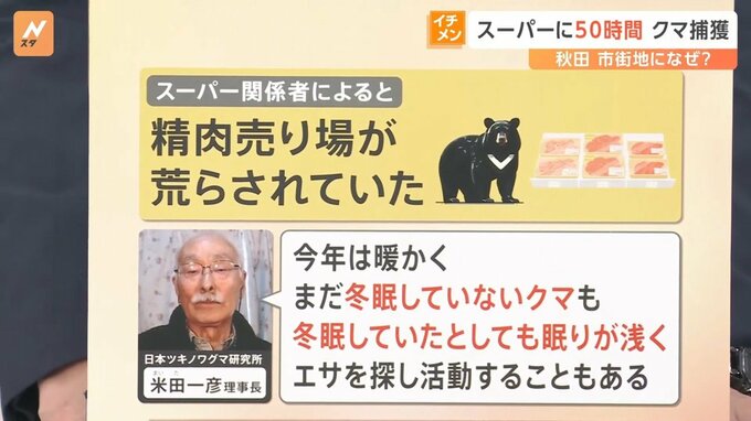 さらに、スーパーの関係者によると「精肉売り場が荒らされていた」ということでした。その背景には「今年は暖かく、まだ冬眠していないクマもいますし、冬眠をしていたとしても眠りが浅く、エサを探し活動することもある」とのことです。