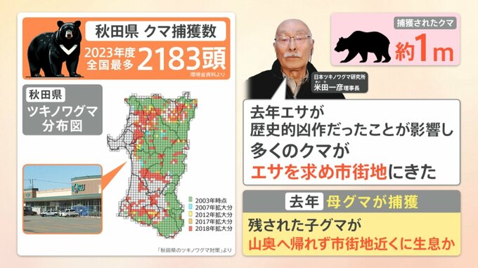 秋田県は2023年度のクマの捕獲数が2183頭と、全国で一番多くなっています。さらに年々生息域は拡大しており、2003年と比較すると2018年には市街地方向に広がってきています。