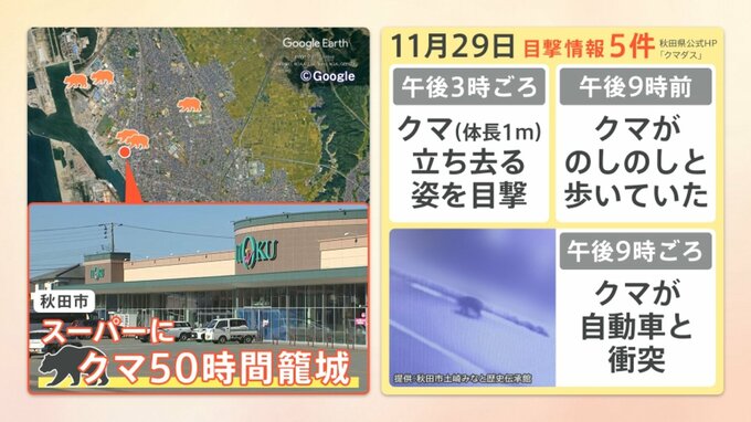 秋田県公式HP「クマダス」によると、周辺ではスーパーにクマがこもる前日の11月29日には目撃情報が5件あり、様々な情報がありました。