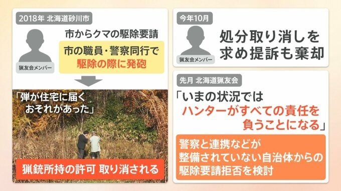 今年10月、猟友会メンバーも処分の取り消しを求めて提訴しましたが棄却されました。北海道の猟友会も「いまの状況ではハンターがすべての責任を負うことになる」と、警察との連携などが整備されていない自治体からの駆除要請の拒否ということも検討するということも話に上がったそうです。