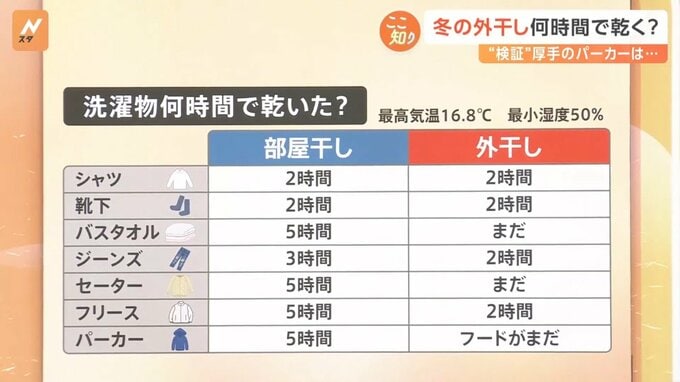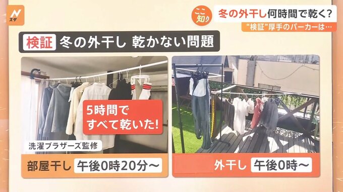 “検証”冬の外干し何時間で乾く?快晴なら外干しでも乾くが“強敵”パーカーは?