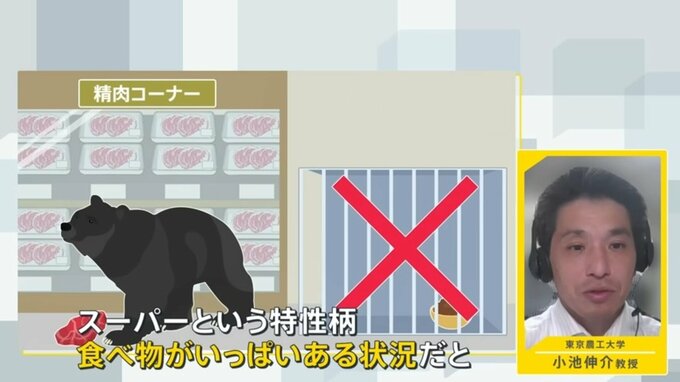 東京農工大学 小池伸介教授「痩せてガリガリとかではなく、冬眠に向けて脂肪をたくわえたクマなのかなと思います。彼らも姿を見られるのはあまり好きじゃないので、ちょっと隠れるつもりで入ったら、たまたまスーパーだっただけで、スーパーを狙って入ったわけじゃないと思います」