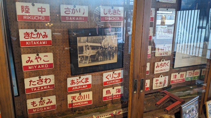 店内には行先表示板、列車名表示板など、国鉄時代に機関庫 や車両基地で行われたイベントで購入して集めた珍しい資料が飾られています。