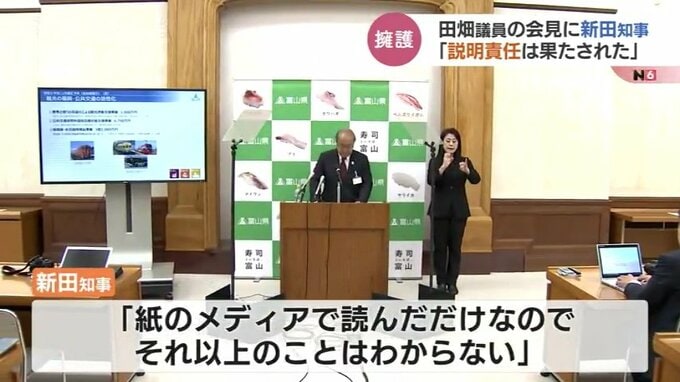 新田知事は「紙のメディアで読んだだけなので、それ以上のことはわからない」と前置きしたうえで、メディアに対する説明責任は果たされたとの認識を示しました。
