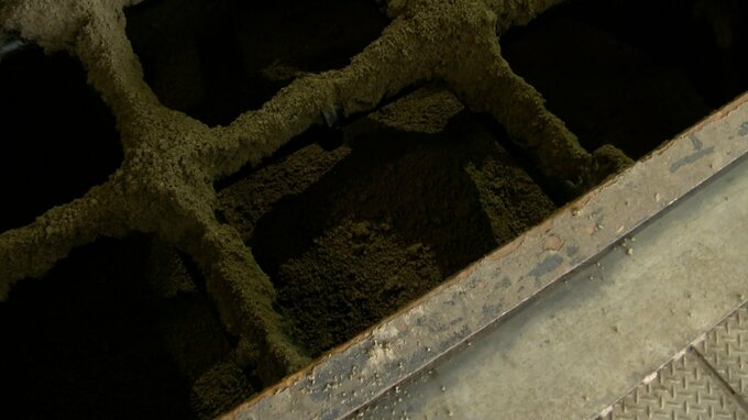 RKB 岩本大志記者「こちらにあるのが脱水して運ばれてきた汚泥です。近づいてみるとかなりにおいがきついです」