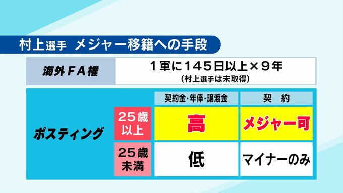 メジャーに移籍するには、主に海外フリーエージェント(FA)権とポスティングシステムの二つの方法がありますが、村上選手はポスティングシステムを使う考えです。