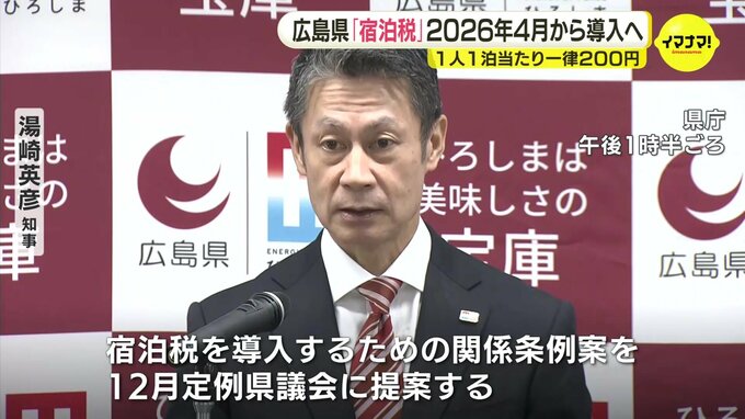 広島県の湯崎知事は3日、2026年4月から宿泊税を導入するため、条例案を12月定例会に提案すると発表しました。広島県 湯崎英彦知事「宿泊税を導入するための関係条例案を、12月定例県議会に提案する」宿泊税を導入…