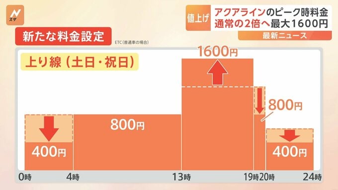 千葉県は東京湾アクアラインで試験的に導入されている料金体系について、来年4月から渋滞ピーク時の通行料金を通常の2倍に値上げする見直し案を明らかにしました。東京湾アクアラインでは、渋滞緩和のために、ETC…