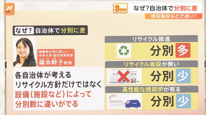 廃棄物分別に詳しい中央大学総合政策学部の篠木幹子教授によると「各自治体が考えるリサイクル方針だけではなく、設備(施設など)によって分別数に違いがでる」ということだそうです。