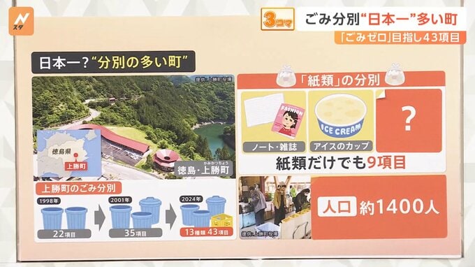 日本で最も分別が多いとされている徳島県上勝町では、分別項目は1998年には22項目、2001年には35項目、2024年には13種類43項目にわたっています。