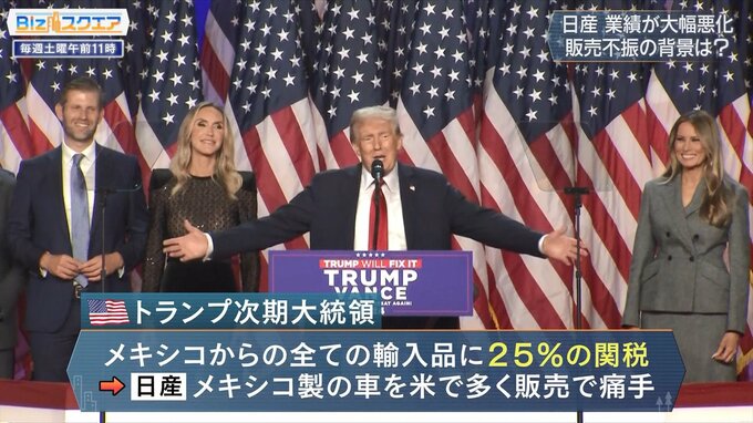 さらに11月25日、アメリカのトランプ次期大統領がメキシコからの全ての輸入品に25%の関税を課すと表明。日産はメキシコの工場で作った車をアメリカで多く販売するため、大きな痛手となる。