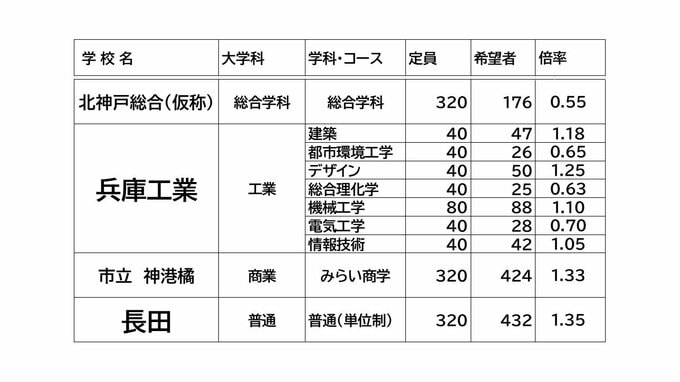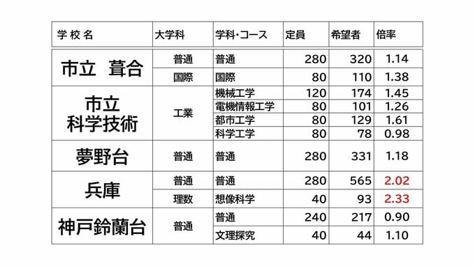兵庫県公立高校入試2025 御影(文理探究)4.05倍 神戸(理数)2.58倍 市立西宮(理数)2.35倍【高校受験12月発表・令和7年度進学希望動向調査】 毎日放送 2024年12月6日(金) 09:27 国内 兵庫高校は2倍超 長田高校は1.35倍 兵庫高校の普通には565人が希望し、2.02倍。兵庫高校の理数:想像科学には定員40人に93人が希望し、2.33倍となっています。