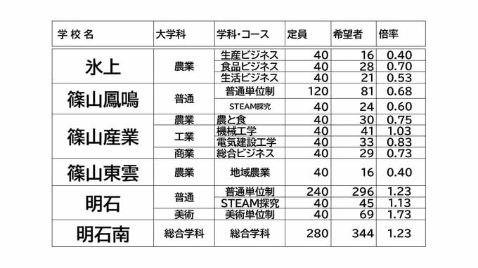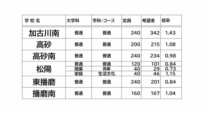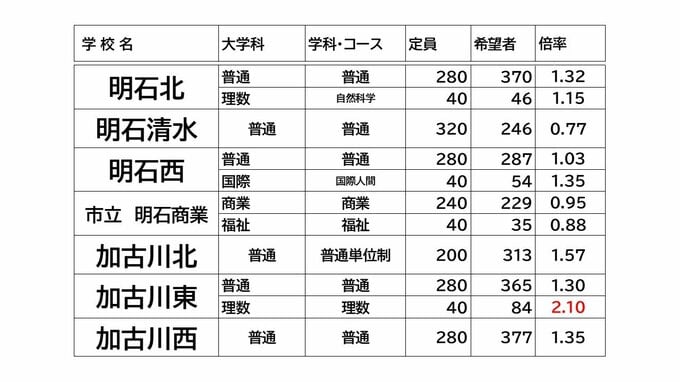 兵庫県公立高校入試2025 御影(文理探究)4.05倍 神戸(理数)2.58倍 市立西宮(理数)2.35倍【高校受験12月発表・令和7年度進学希望動向調査】 毎日放送 2024年12月6日(金) 09:27 国内 加古川東高校は2倍超 明石高校は1.13~1.73倍 加古川東高校の普通には365人が希望し、1.3倍。加古川東高校の理数には定員40人に84人が希望し、2.1倍となっています。