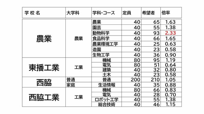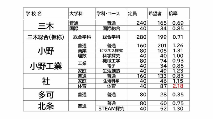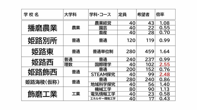 兵庫県公立高校入試2025 御影(文理探究)4.05倍 神戸(理数)2.58倍 市立西宮(理数)2.35倍【高校受験12月発表・令和7年度進学希望動向調査】 毎日放送 2024年12月6日(金) 09:27 国内 姫路西高校は2.55倍 社高校(体育)は2.18倍 姫路西高校の理数には102人が希望し、2.55倍。社高校の体育には定員40人に87人が希望し、2.18倍となっています。