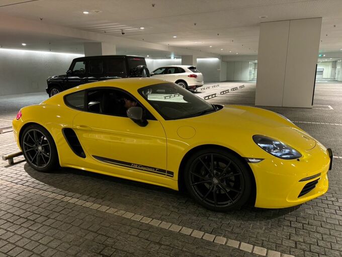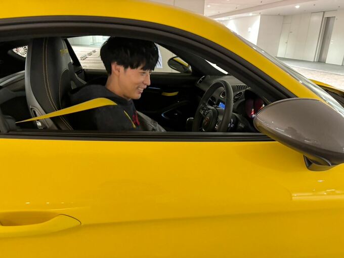 大石さんは「車検の代車がバッチバチ目立つポルシェでわろてる」と投稿。その写真は、真っ黄色なボディの「ポルシェ718ケイマンT」。クーペスタイル・排気量2,000cc・出力300馬力のスポーツカーという中身も強烈で、もう一枚投稿された写真では、大石さんがコクピットでまるで子どものように無邪気に笑っています。