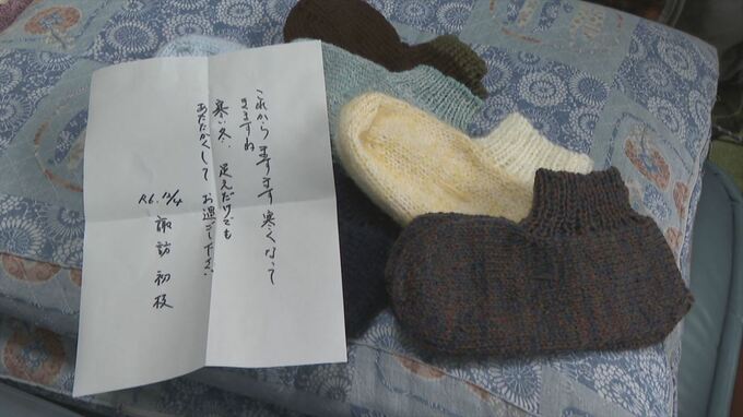 「こちらの色とりどりの靴下、すべて手編みで編まれていて、靴下ひとつひとつには被災地へ向けたメッセージが添えられているんです」