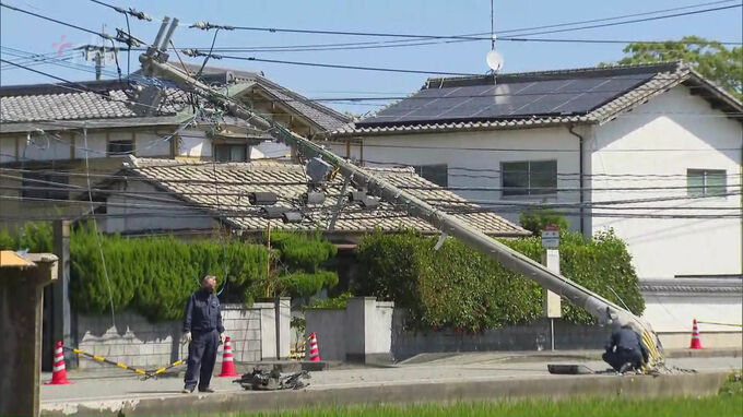 21日午前、福岡県粕屋町でダンプカーが電柱に激突し、横転しました。電柱が近くの住宅に倒れかかっています。◆電柱2本が傾き1本が住宅に21日午前10時前、粕屋町戸原西でダンプカーが電柱に激突しまし…