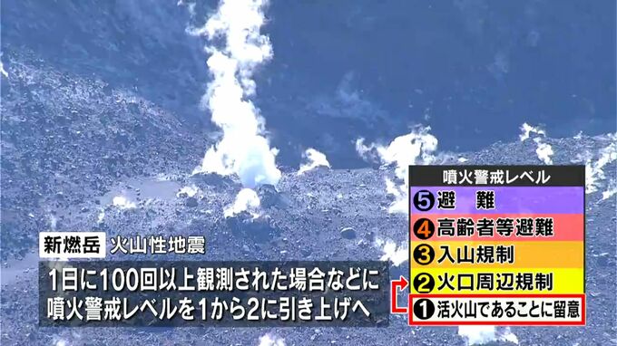 新燃岳は1日に100回以上の火山性地震が観測された場合などに、噴火警戒レベルを「活火山であることに留意」の1から、「火口周辺規制」の2に引き上げることになっています。