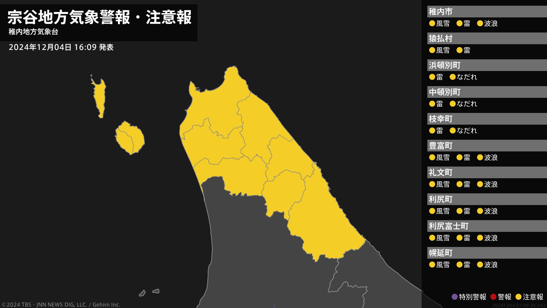 気象台は、午後4時9分に、なだれ注意報を浜頓別町、中頓別町、枝幸町に発表しました。