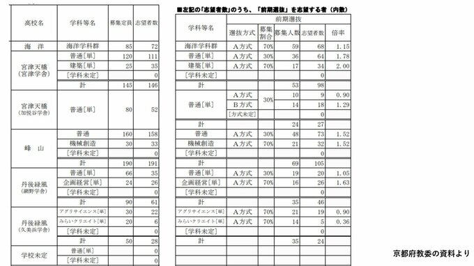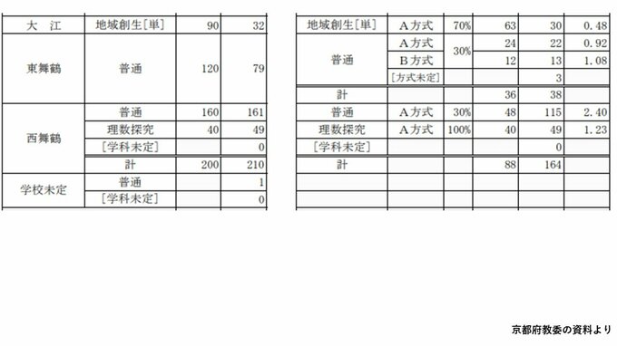 京都府公立高校入試2025 堀川2.04倍 嵯峨野2.31倍 鴨沂6.71倍が府内最高倍率 福知山2.13倍【令和7年度高校受験12月発表 進路志望状況調査】 毎日放送 2024年12月6日(金) 09:27 国内 福知山(普通)2.13倍 西舞鶴(理数探究)は1.23倍 福知山高校の普通には102人が希望し、2.13倍。西舞鶴高校の理数探究(前期選抜で100%募集)は、40人に49人が希望して1.23倍となっています。