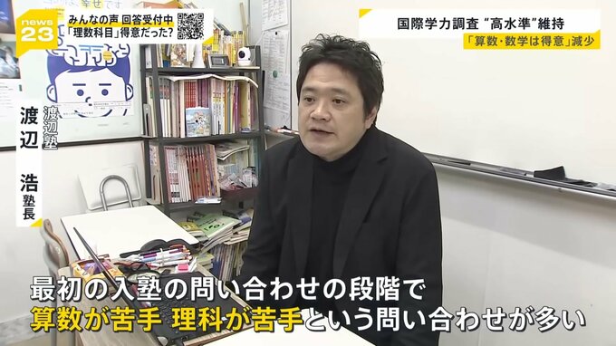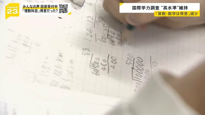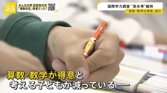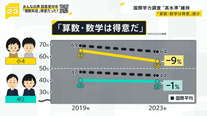 一方、今回の調査で算数・数学が「得意だ」と答えた割合が、小学4年は前回より9ポイント、中学2年は1ポイント下がり、いずれも国際平均を下回る結果となりました。