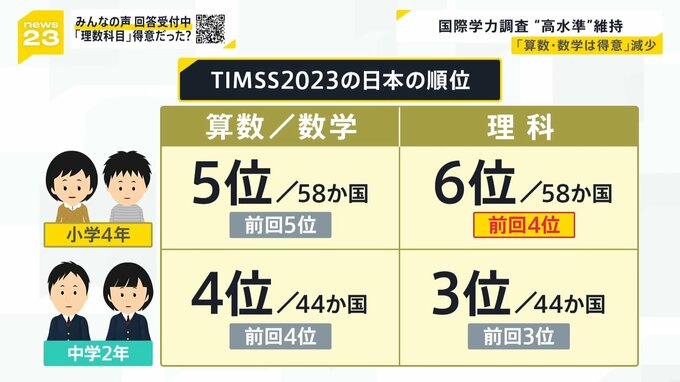 58か国・地域の小学4年生、44か国・地域の中学2年生が参加して、2023年に実施された最新の調査結果が公表されました。