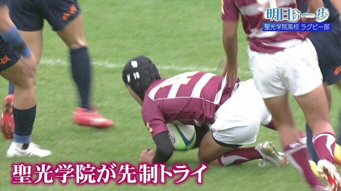 試合は開始早々、聖光学院がディフェンスの隙をつくステップと走りで先制トライ。
