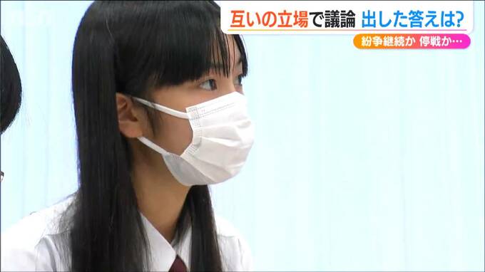 遠い国の人々の心情を想像しながら話し合った後、紛争を続けるべきか、やめるべきか、班ごとに答えを出しました。