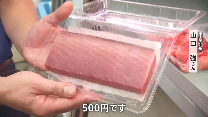「500円です。メバチマグロの中トロが500円です。これ私でも買いたいぐらいですね」
