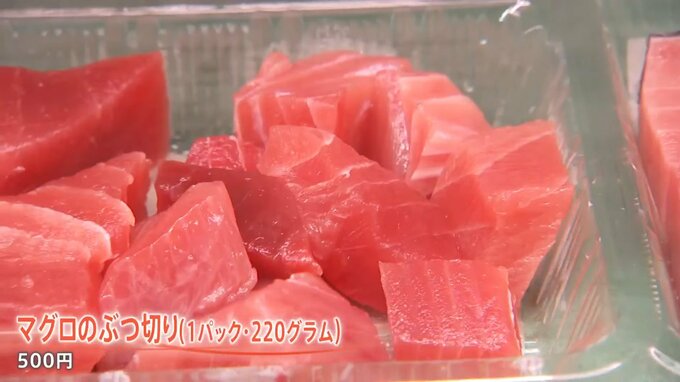 こちらのマグロのぶつ切りは、1パック・220g入って、ワンコインの500円!なんと、中トロも混ざっているそうです。